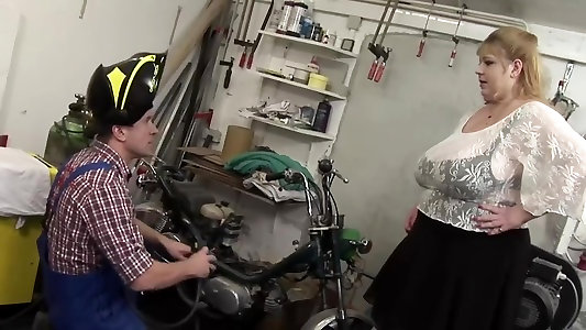 Super-naughty blond cougar with massive milk melons is having rough hump with her much younger lover