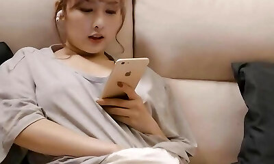 Platinum-blonde uber-sexy Asian wife with big boobs and big butts have sex with her husband all the morning